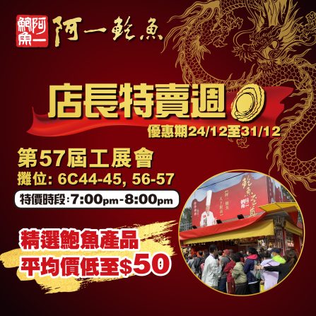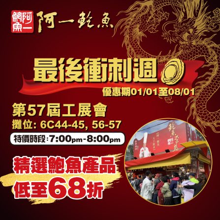 第57屆工展會開鑼啦!為咗答謝大家一路以黎嘅支持,鮑魚公主Lisa Lau 今年準備咗一連串嘅驚喜優惠比大家,價值$500嘅鮑魚福袋今年工展超值震撼價$1️就可以買到 每日限量20個,一連八日(16/12-23/12)回饋大家!精選鮑魚海味多買多送...